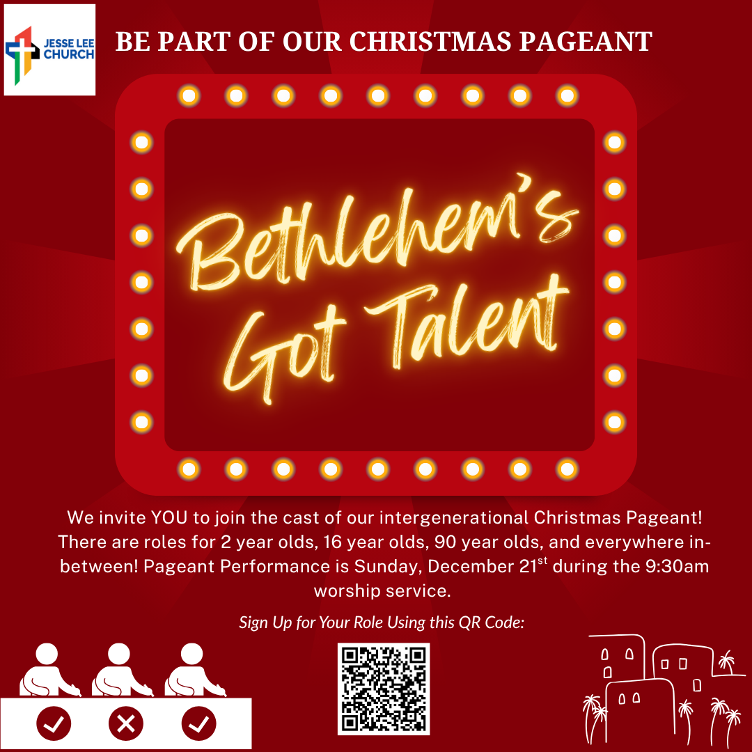 Join us for an intergenerational Christmas Pageant – Bethlehem’s Got Talent – on Sunday, December 21, 2025 during the 9:30 a.m. worship service.
