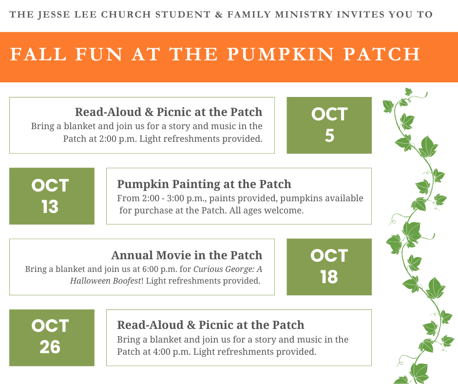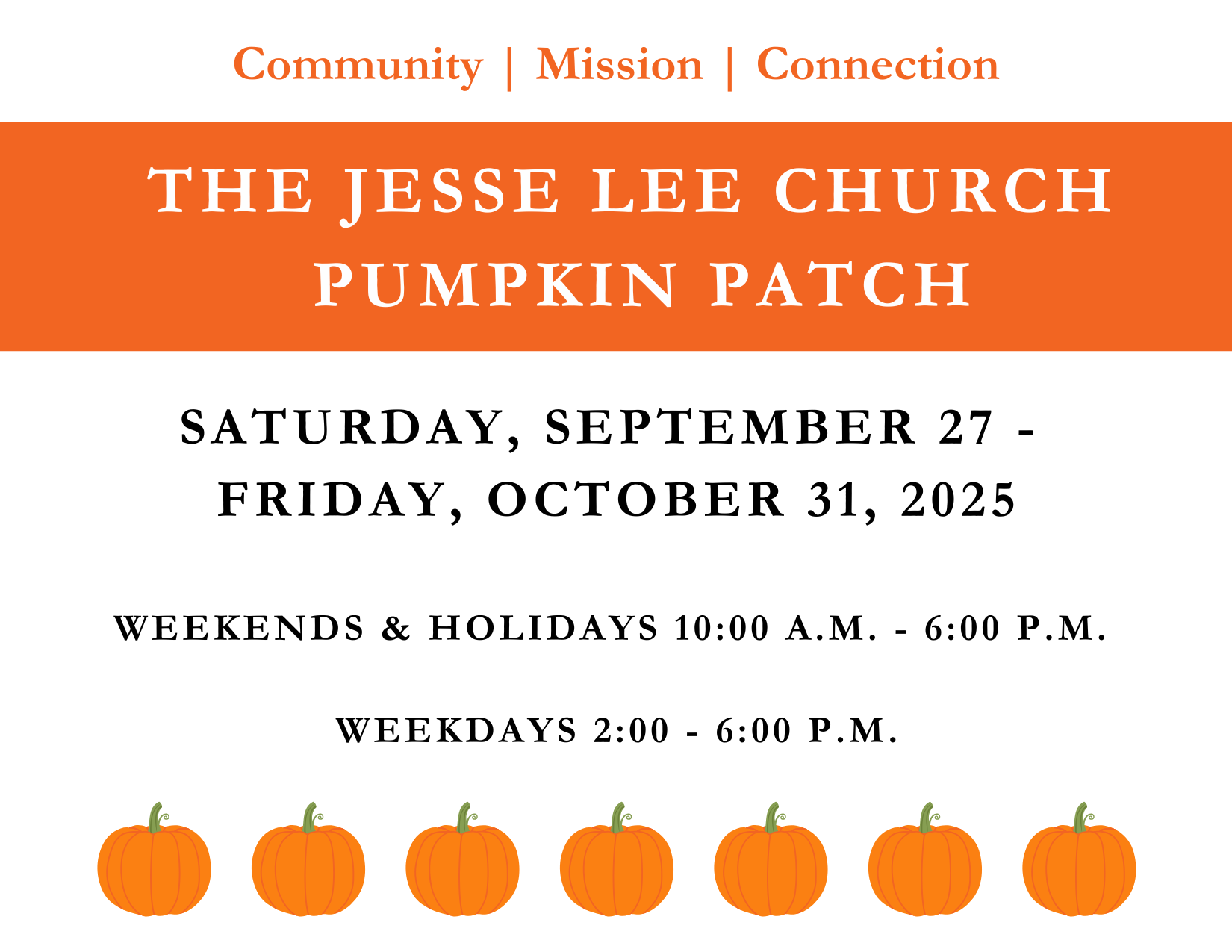 Meet us at the Patch! The Jesse Lee Pumpkin Patch will be open Saturday, September 27 – Friday, October 31, 2025